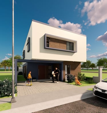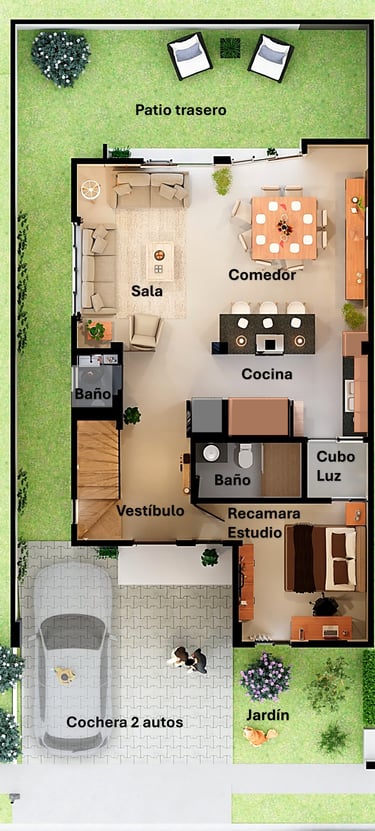 En planta baja encontramos cochera para 2 autos semi techada, recamara con baño completo, vestibulo, medio baño, cocina integral con isla desayunador, cubo de luz, amplia sala-comedor, terraza posterior, pasillo lateral y area de guardado debajo de la escalera.