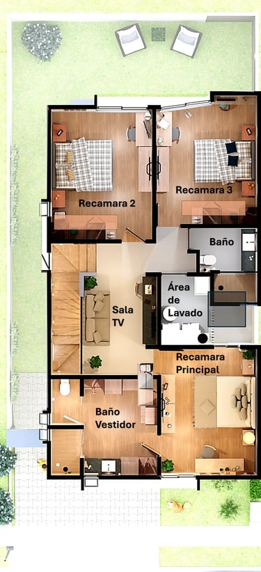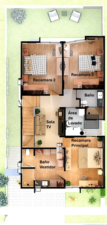 Planta alta con sala de tv, área de lavado, 2 recamaras con closet y baño compartido, recamara principal con vestidor y baño completo.